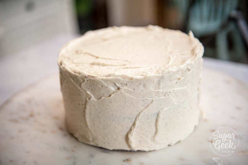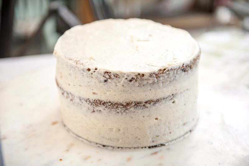 - Cover the whole cake in another thick layer of frosting. I like to keep my frosting rustic looking.