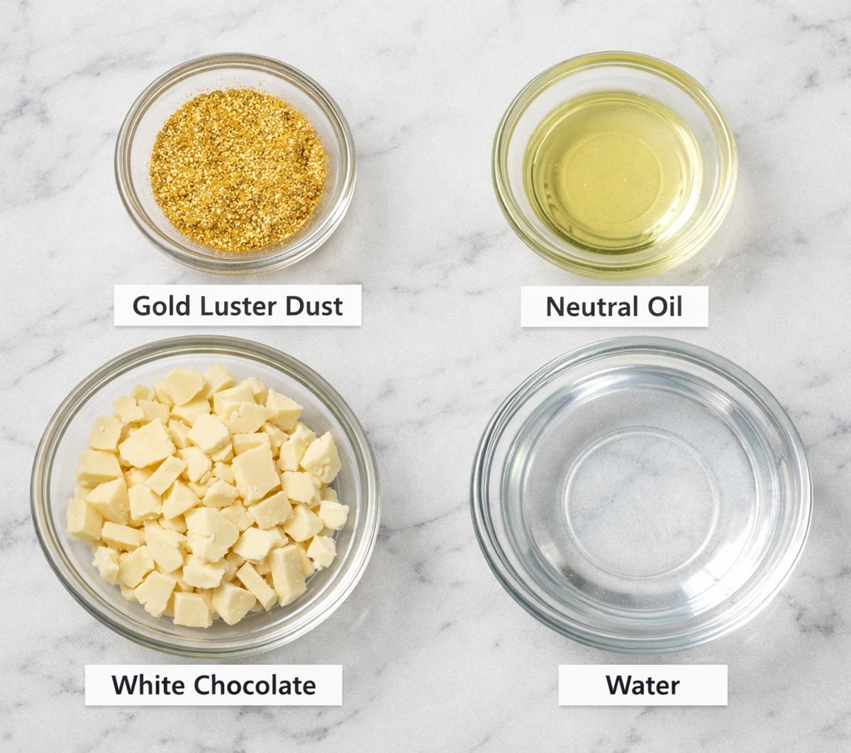 All you need to make a gold drip is some chocolate, water, gold dust, and oil.