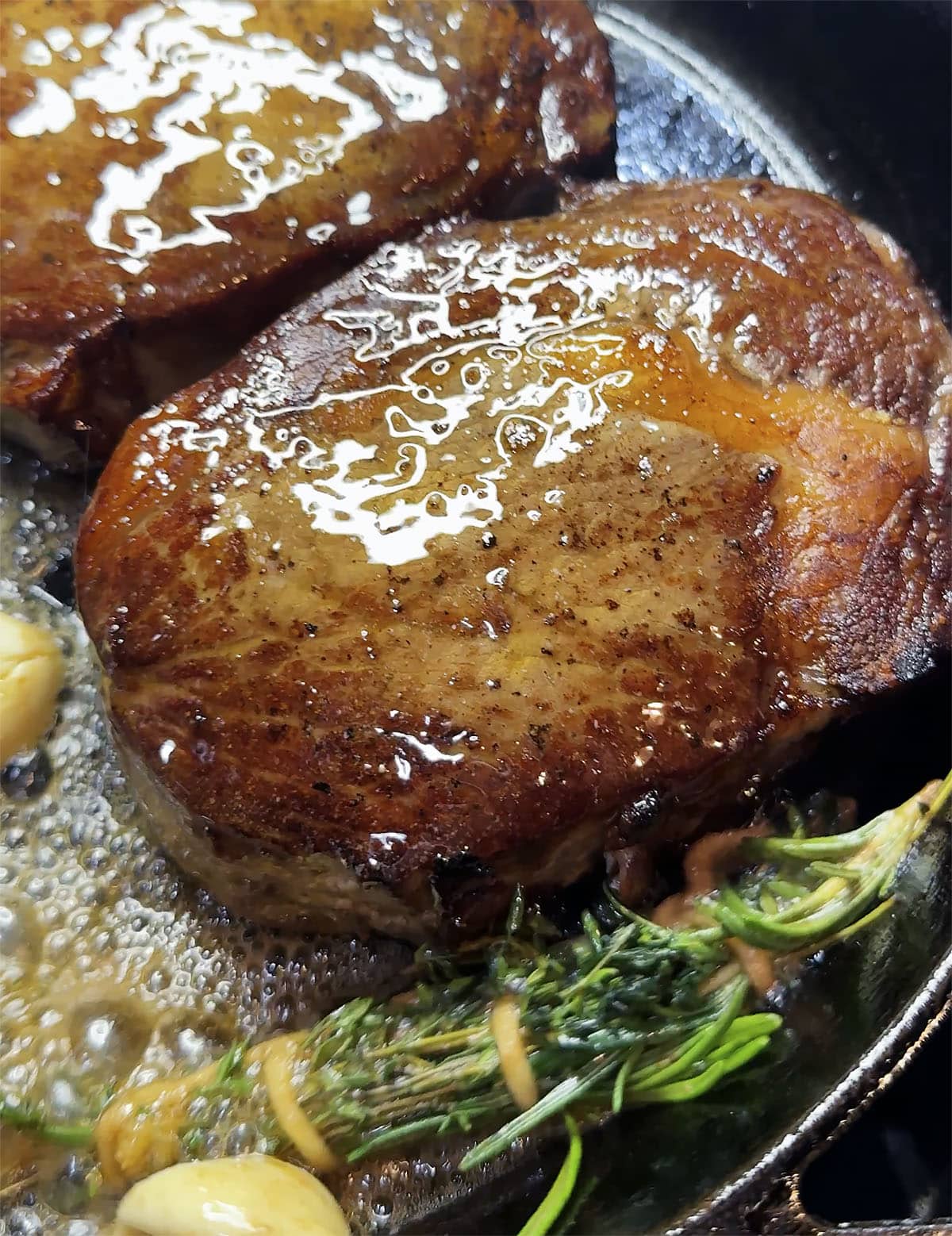 - Add your butter, garlic, and thyme to the pan and begin basting your steak with the butter mixture.