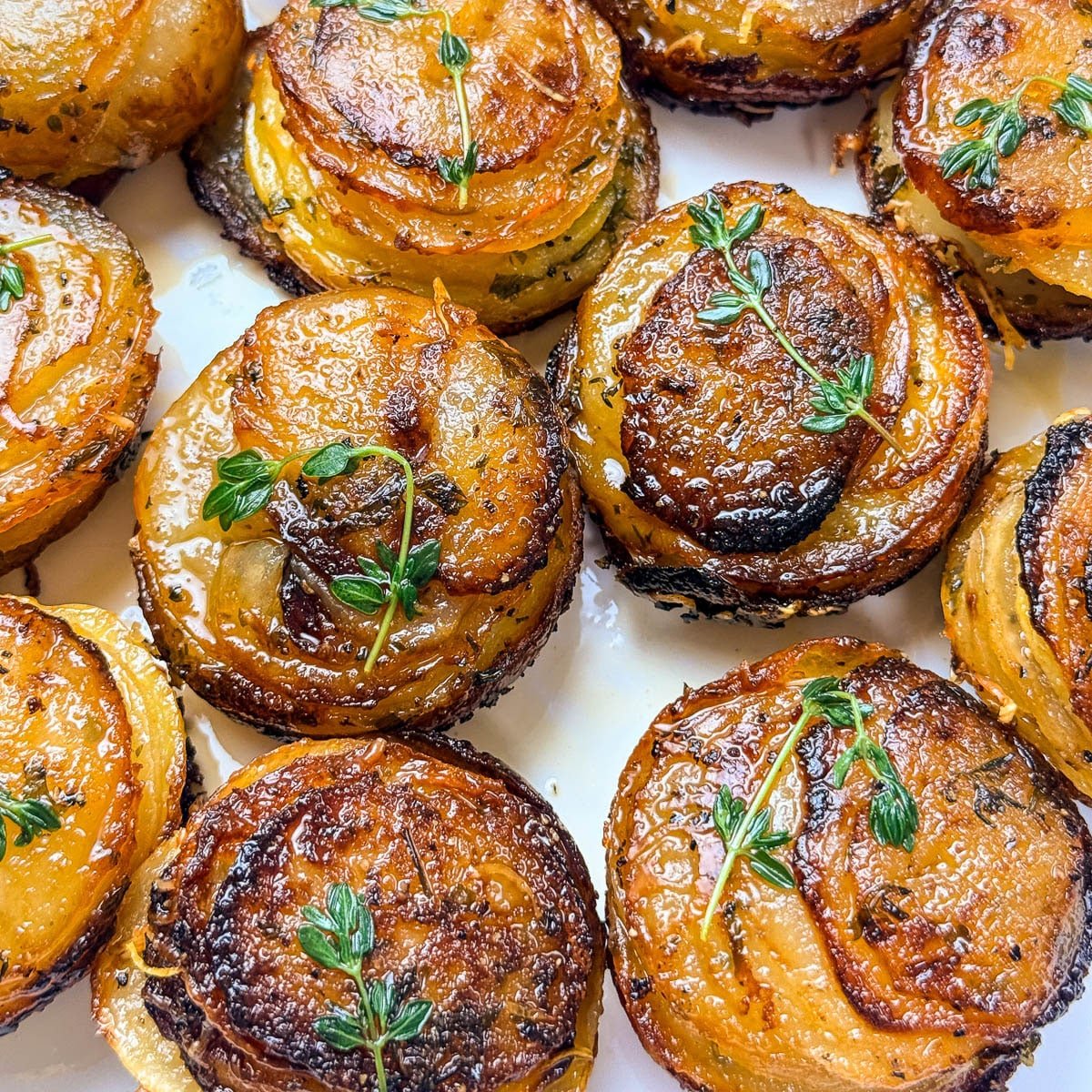 Potato stacks are the perfect way to dress up any meal, whether it’s a casual weeknight or a full-on fancy holiday dinner. It’s such a fun way to showcase layers of potatoes, butter, and herbs, and they always disappear fast.