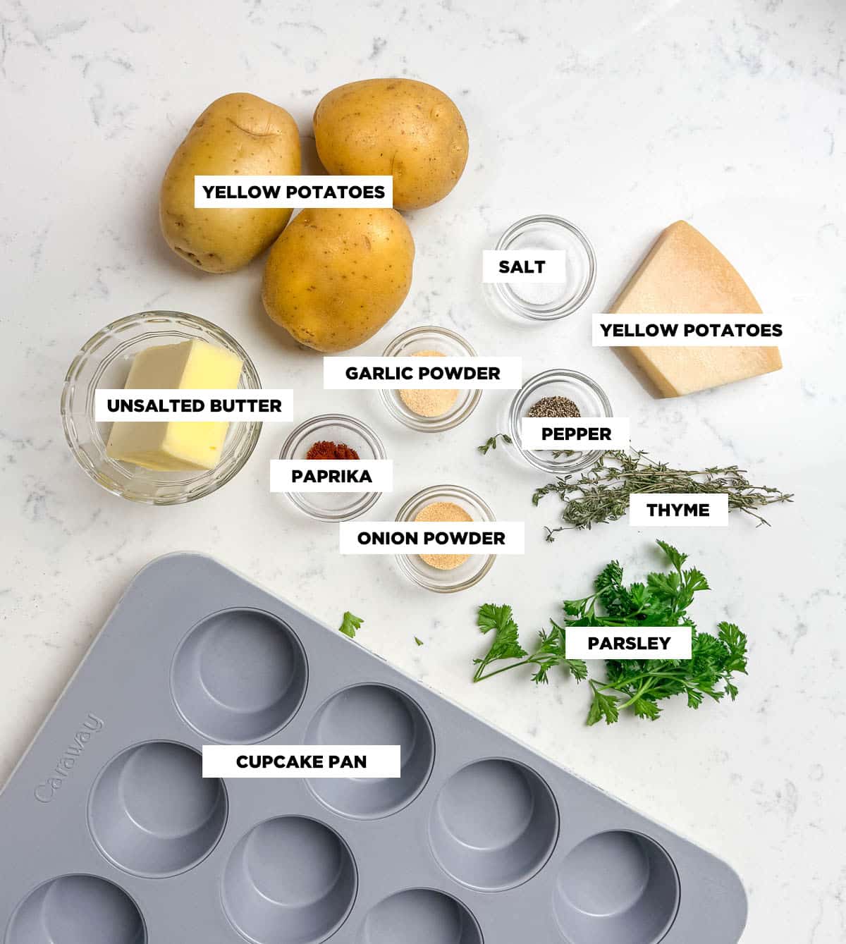 Cheese - You’ll also need grated Parmesan cheese or Parmesan Reggiano to sprinkle between the layers of potatoes. The cheese melts down into the slices, giving each stack a golden brown top and slightly cheesy edges. If you’re a sour cream fan, these pair perfectly with a dollop on the side.