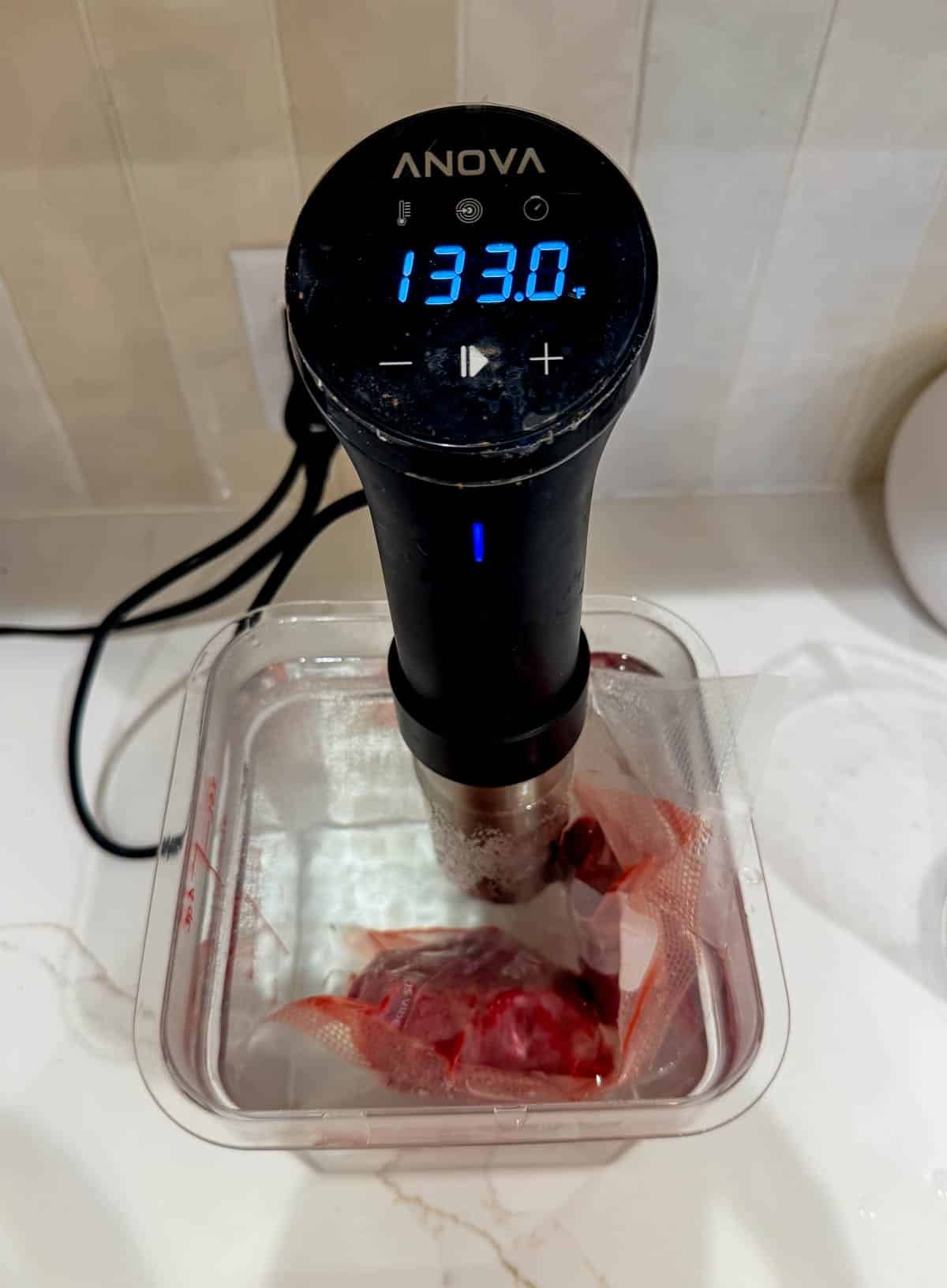 Why: Beyond keeping the water out, removing air ensures the meat is in direct contact with the bag, which is in direct contact with the water. This allows for conduction—the most efficient way to transfer heat evenly. If you don't have a vacuum sealer, you can use the water displacement method with a regular ziplock bag. - Set your temperature - At 131°F, the collagen in the beef begins to soften, but the muscle fibers don't contract so tightly that they squeeze out all the moisture (which happens at higher temps). You get the tenderness of a long braise with the texture of a steak. If you want a more "done" steak, you can refer to the chart below for guidance.