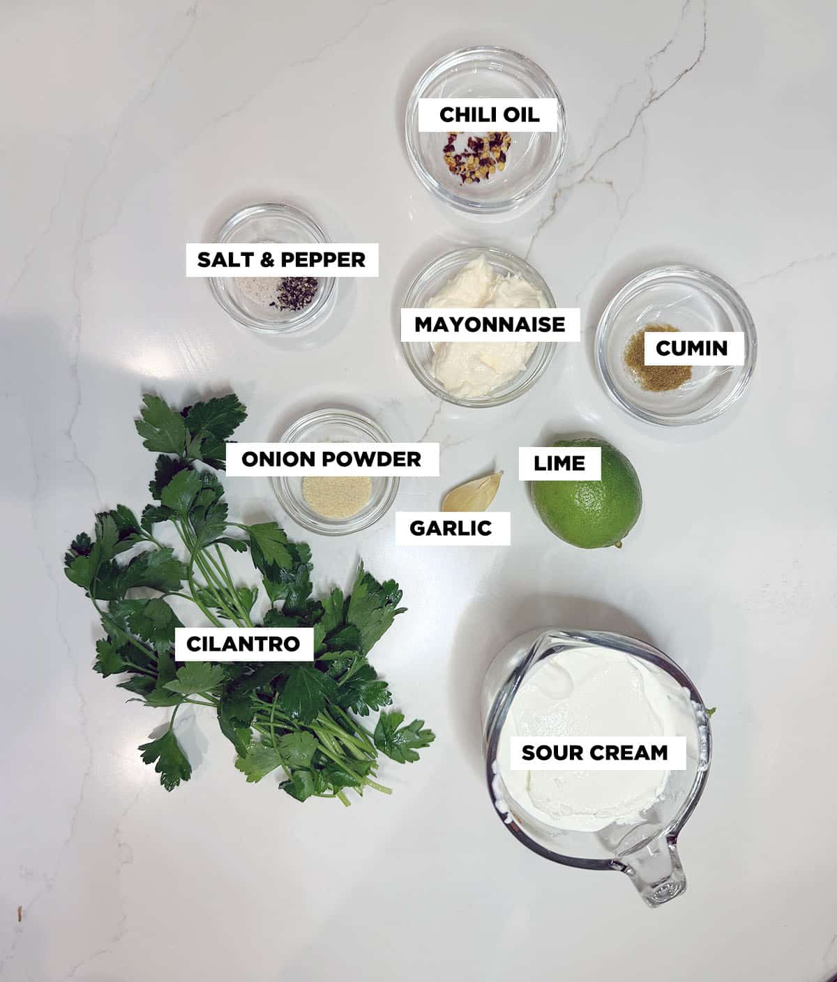 The base of this crema starts with sour cream and mayonnaise. American sour cream is easy to find and gives that classic creamy texture, while mayo adds richness and helps emulsify everything in the food processor. You can absolutely swap in plain Greek yogurt or even vegan sour cream if that’s what you have on hand. Traditional Mexican crema, french crème fraîche, or even a splash of heavy cream or a little milk can be used next time if you want to experiment with the texture of the crema.