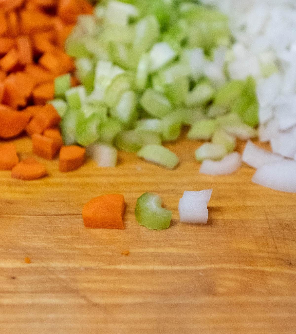 - Dice the celery: Keep the pieces close in size to the onion and carrot.