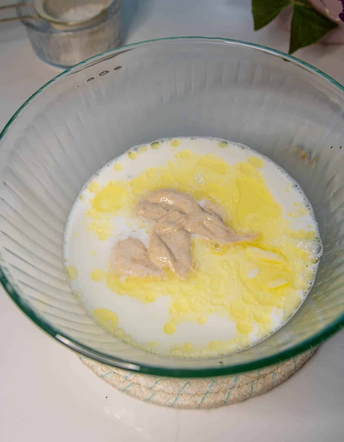 - Combine ½ cup (100 g) active sourdough starter with the warm milk, sugar, melted butter, warm honey, and sourdough discard in a large bowl. Whisk until the starter is dissolved.