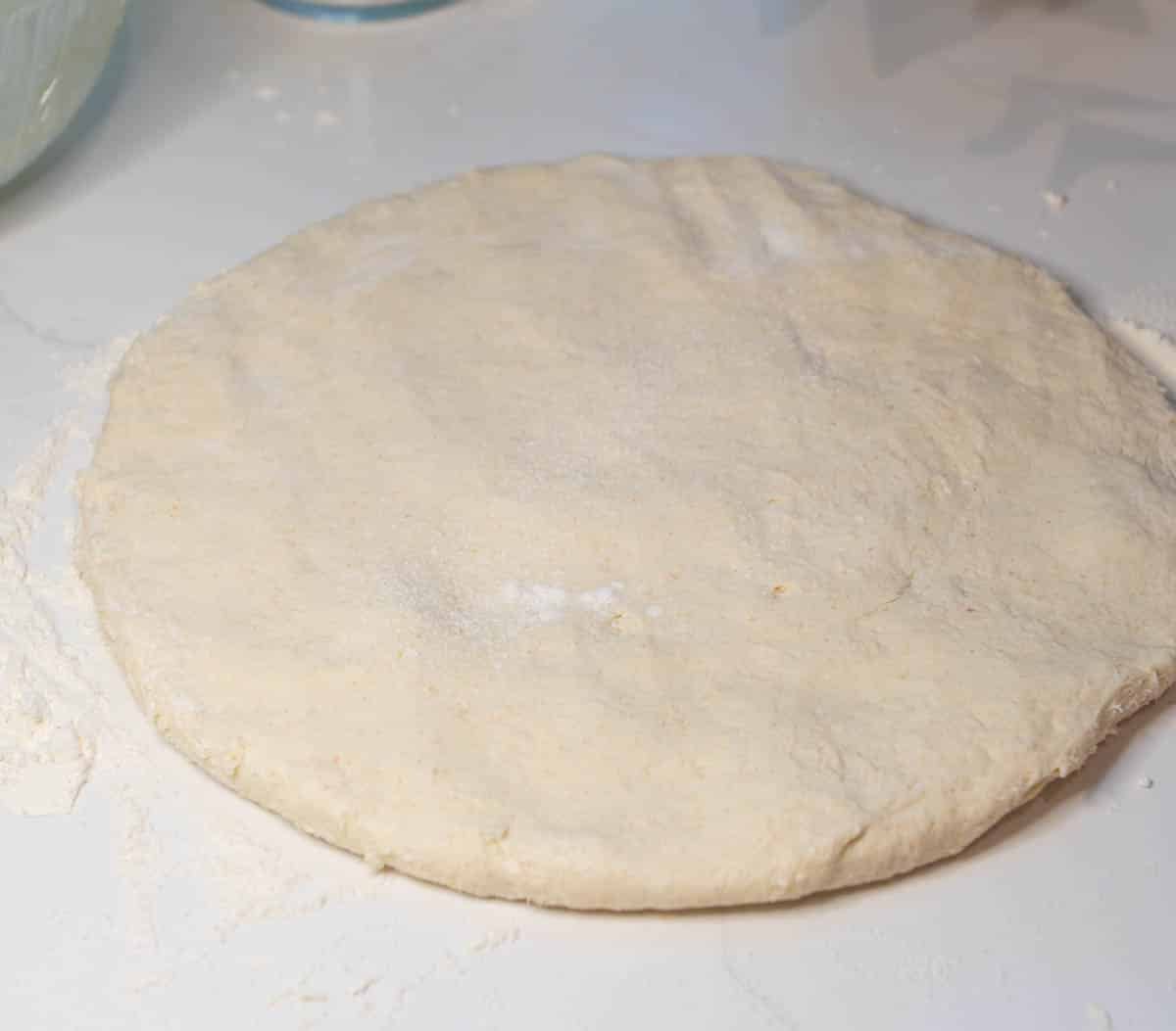 - Gently turn your dough out onto a floured surface and sprinkle a little flour on top. Use your fingertips to press it out until it’s about ½ inch thick.