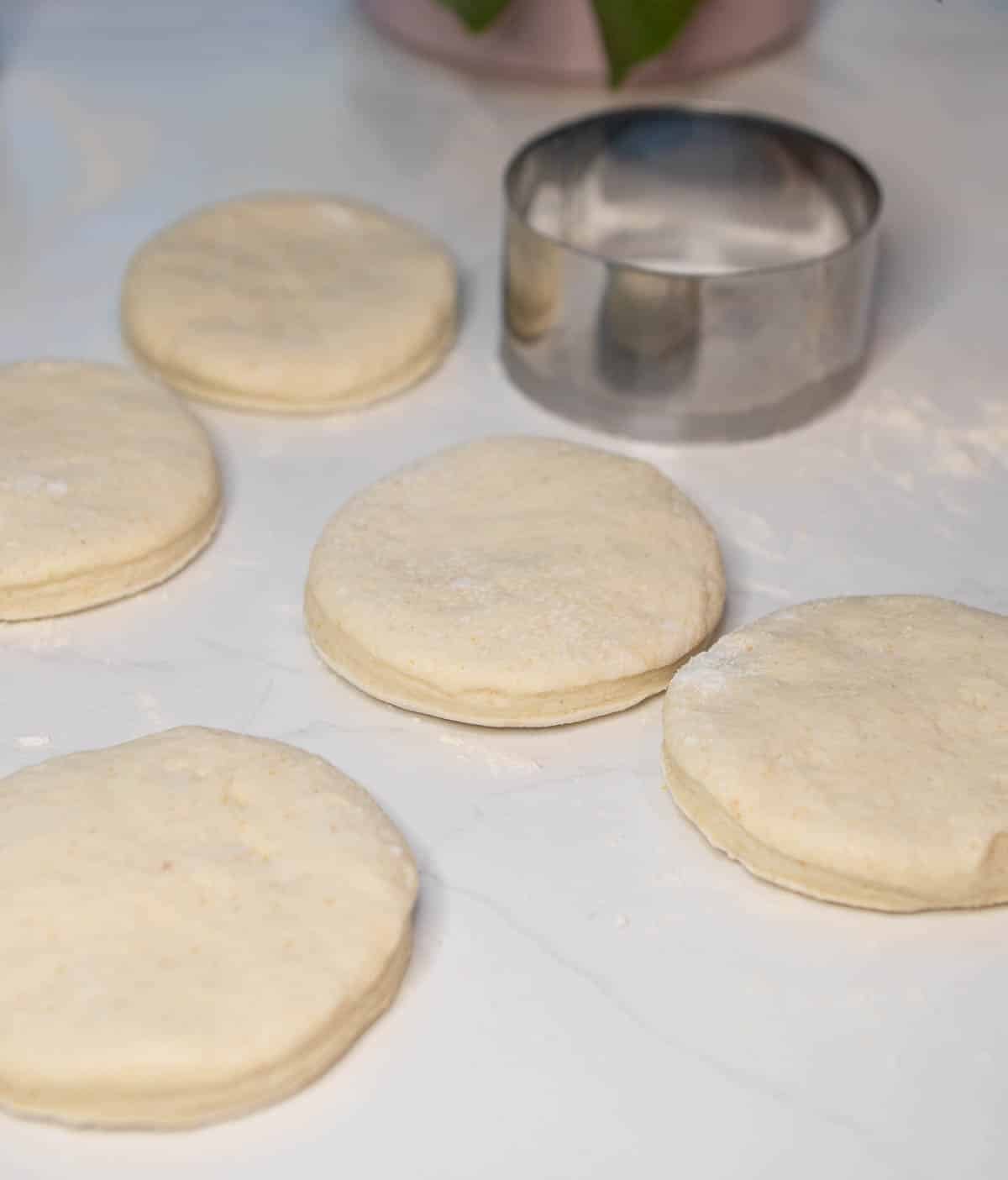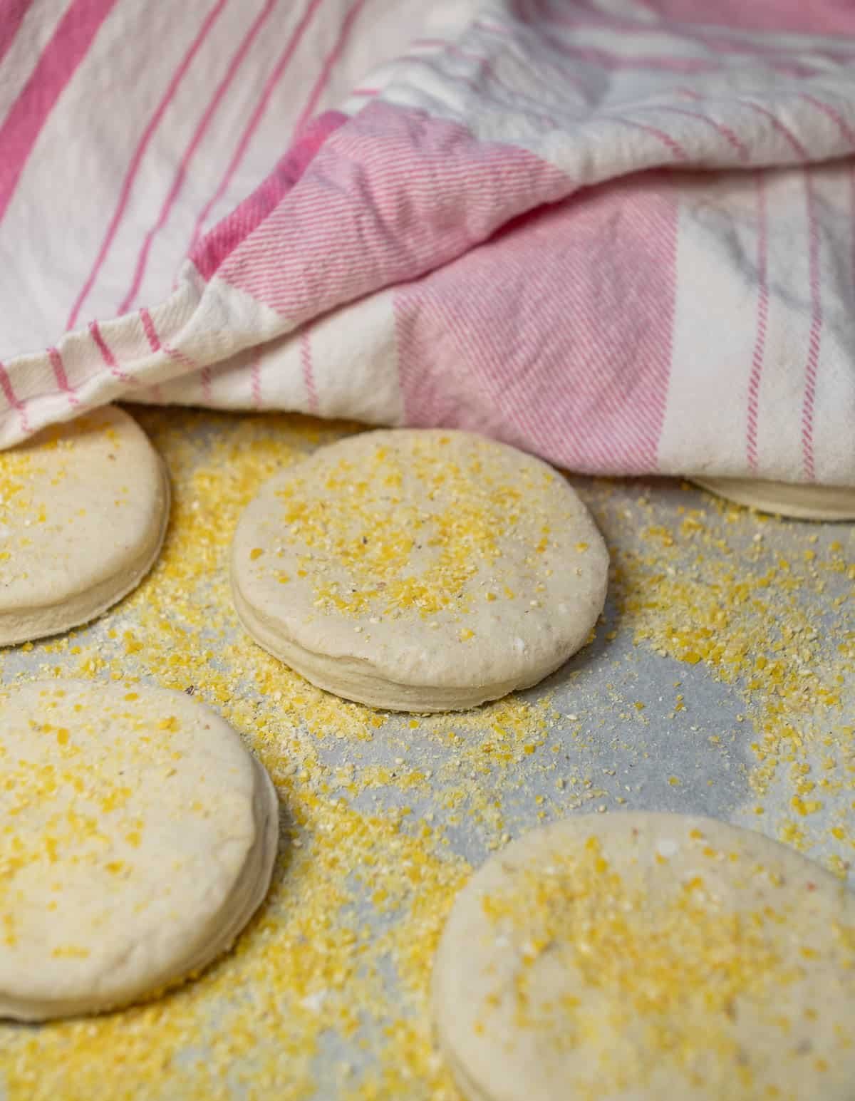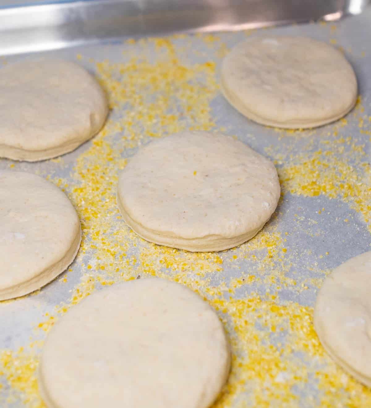 - Grab a 3-inch biscuit cutter and cut out your muffins. Place them on a baking sheet lined with parchment paper that’s been dusted with cornmeal, then sprinkle a little more cornmeal on top. Cover the pan with a tea towel and let the muffins rise for 1 hour at room temperature.