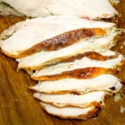 Place the turkey breast on top and bake in the oven for 15 minutes per pound or until a thermometer reads 162ºF in the thickest part of the breast. It will continue to cook as it rests.