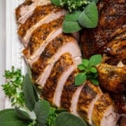 Rinse the turkey (if desired) and pat it completely dry with paper towels. Moisture on the surface prevents crisp skin, so make sure it’s dry all over.